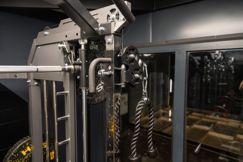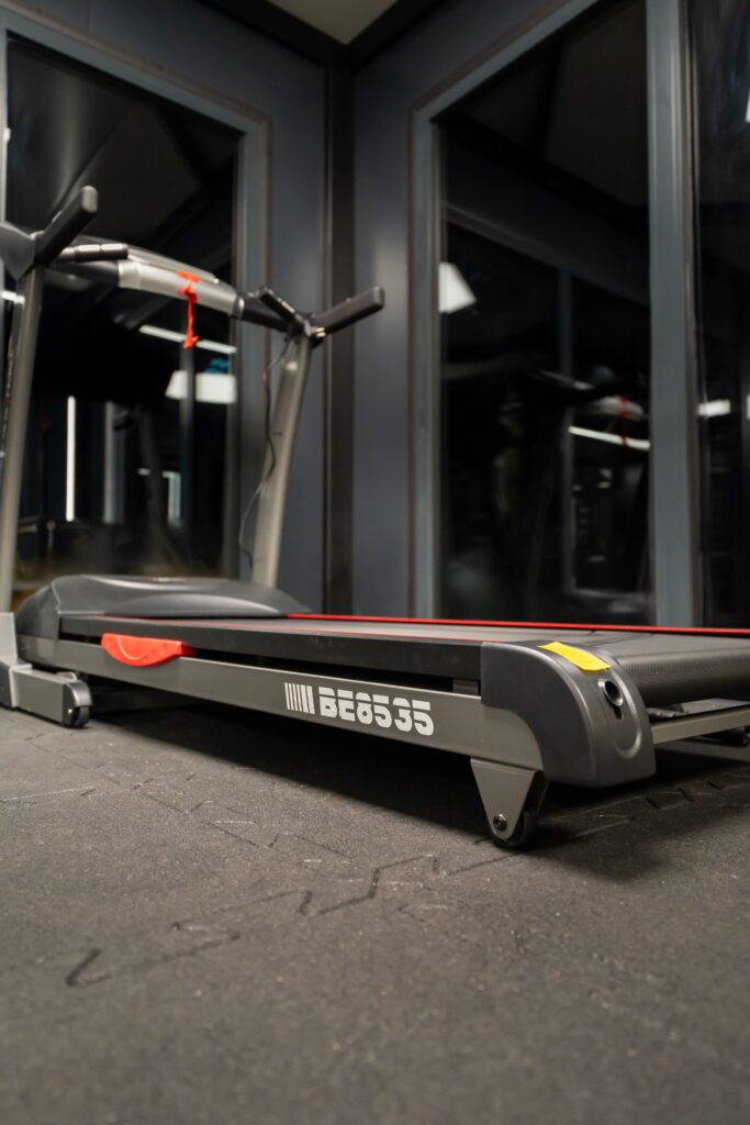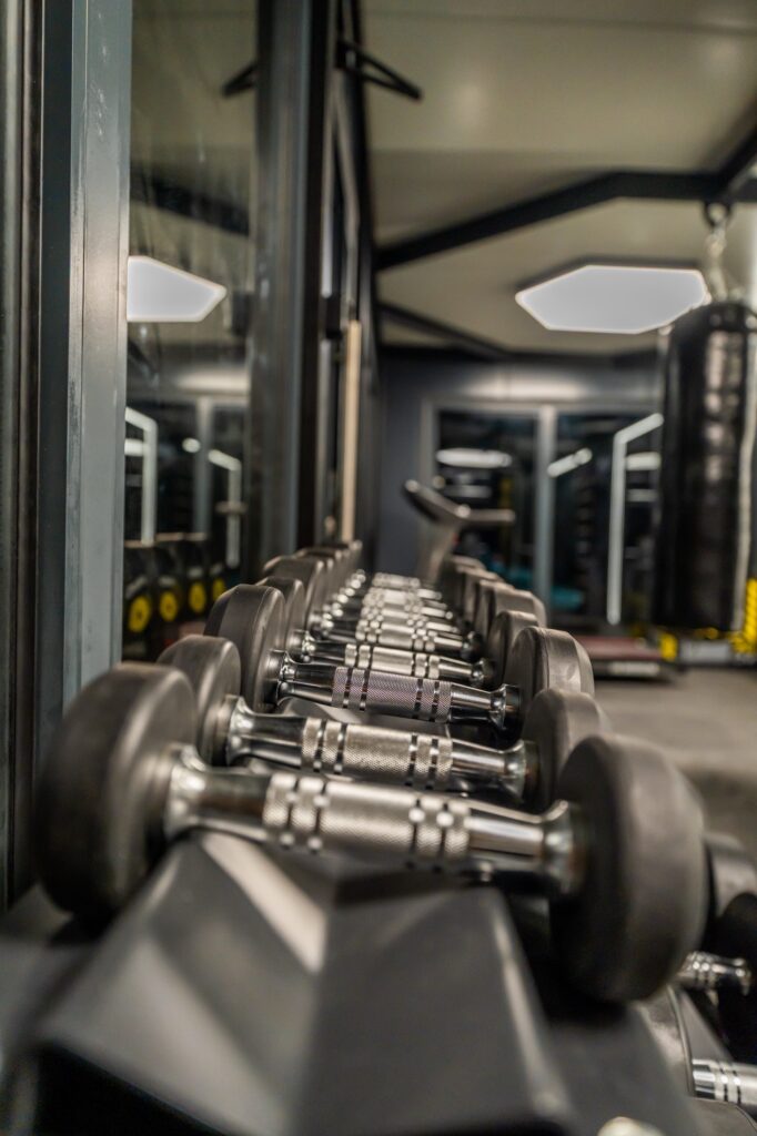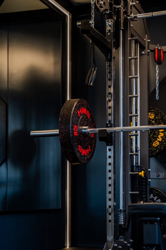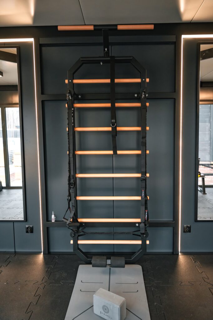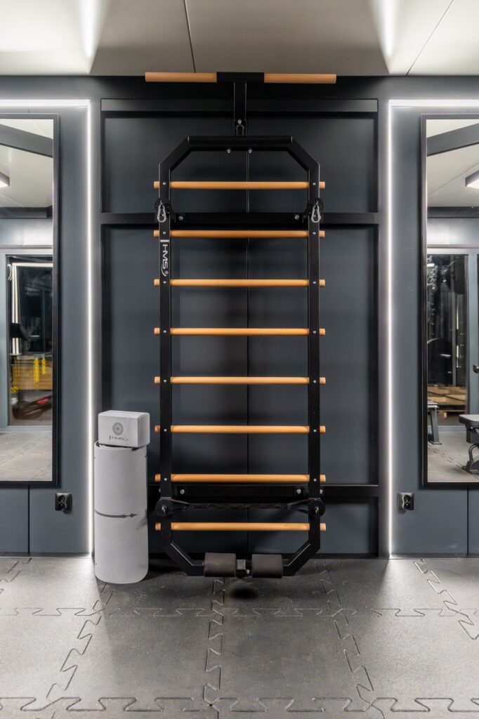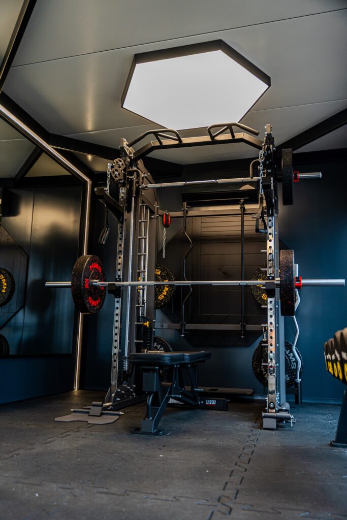 Wnętrze GYM BOX wykończone ciemnymi płytami warstwowymi tworzy klimat profesjonalnej siłowni premium — motywujący do treningu od pierwszego wejścia.